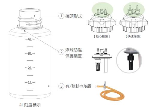 特色: ◆ 大容量 ◆ 便利插心接頭 ◆ 預(yù)防泵進水的防溢保護裝置 ◆ 便利排水裝置 |